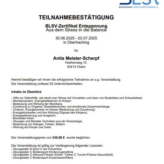 - Entspannungstrainerin (BLSV Zertifikat)