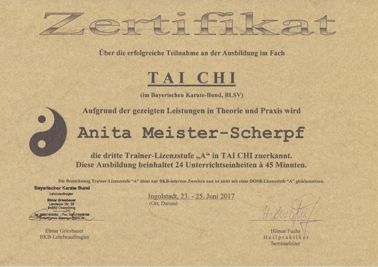 - Tai Chi Chuan Trainerin Lizenz A (DKV)
